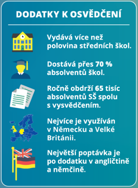 Hledáte práci, studium nebo brigádu a potřebujete ukázat, co jste se naučili na střední škole? Dodatek k osvědčení je dokument, který vám pomůže doložit vaši středoškolskou kvalifikaci v českém a cizím jazyce. Přikládá se k osvědčení ze střední školy, konkrétně k maturitnímu vysvědčení, osvědčení o závěrečné zkoušce a výučnímu listu.