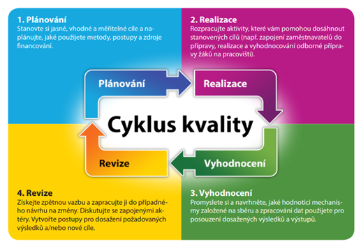 Základním a nejdůležitějším principem zajišťování kvality je cyklus kvality, který probíhá ve čtyřech fázích: plánování, realizace, vyhodnocení a revize.