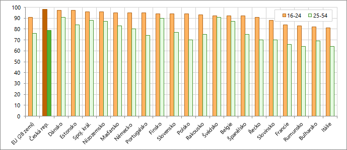 Obrázek 1 ukazuje podíly populace s vyšší úrovní dovedností v této oblasti u mladých lidí ve věkové skupině 16–24 let (tmavé sloupce) a pro porovnání i u věkové skupiny 25–54 let. Lze konstatovat, že v populaci mladých lidí ve většině zemí ovládá 90 % a více mladých tyto poměrně jednoduché činnosti na vyšší než základní úrovni. Opravdu pozadu jsou pouze Rumunsko, Bulharsko a Itálie. U starší populace je situace rozdílná, země s výrazně nižšími podíly těchto dovedností korespondují se zeměmi s nižší vzdělanostní úrovní této věkové skupiny.