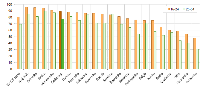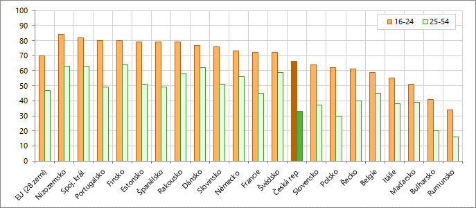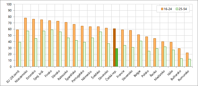 První místa ve věkové skupině 16–24 let zaujímají Nizozemsko (78 %), Estonsko (76 %), Spojené království (75 %) a Finsko (74 %). Nejnižší hodnoty dosahují Maďarsko (40 %), Itálie (39 %), s výrazným odstupem pak Bulharsko (29 %) a Rumunsko (22 %). V České republice dosahuje hodnocení vyšší než základní 61 % mladých lidí.
