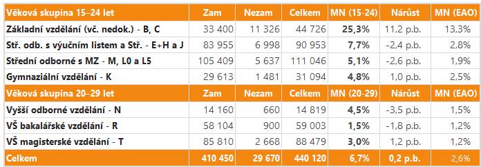 Poměrně vysokou hodnotu vykazují absolventi vyššího odborného vzdělávání (4,5 %), překvapivá je nízká hodnota u absolventů s bakalářským vzděláním (1,5 %), relativně obtížněji nalézají uplatnění mladí absolventi s magisterskou úrovní vzdělání (3,0 %).