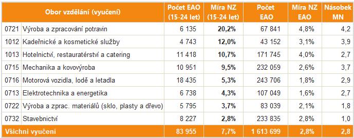 Nepříznivá je situace (míra nezaměstnanosti více než 10 %) u mladých vyučených v oborech Výroba a zpracování potravin, Kadeřnické a kosmetické služby a Hotelnictví, restauratérství a catering.