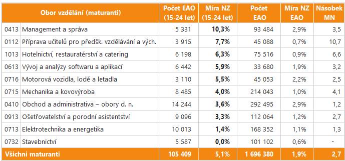 Pozn.: Kódy a názvy oborů vzdělání odpovídají klasifikaci ISCED. Údaje jsou řazeny podle míry nezaměstnanosti mladých. Násobek MN uvádí, kolikanásobně je vyšší nezaměstnanost mladých lidí oproti všem ekonomicky aktivním osobám (EAO) vyučeným v uvedeném oboru vzdělání.