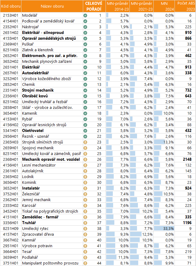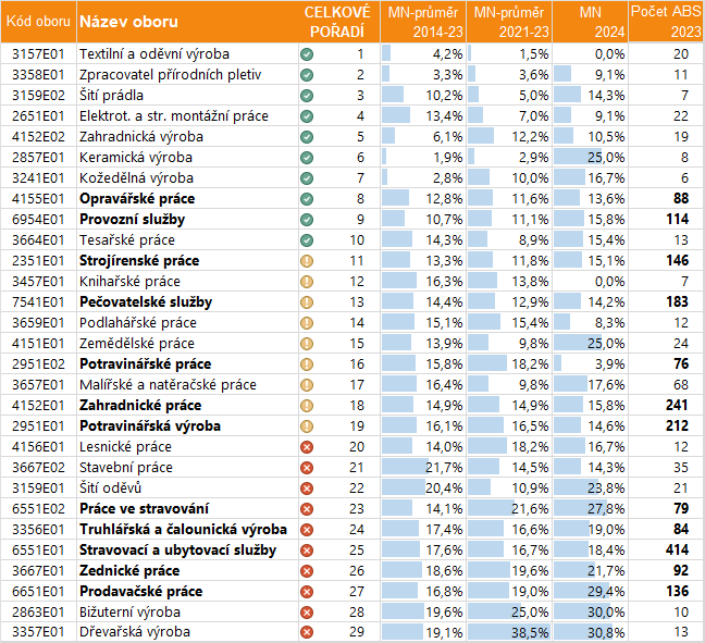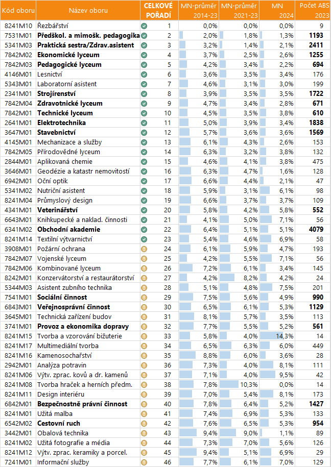 Podrobnější informace o všech oborech jsou v následujících tabulkách, kde jsou údaje o dlouhodobém (2016 až 2025) i krátkodobém průměru (2023 až 2025) a z údaje za rok 2025.