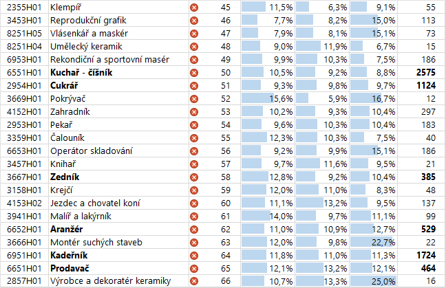 Další tabulky pak pro jednotlivé kategorie poskytují konkrétní údaje o všech oborech vzdělání, přitom berou v úvahu nejen současnou míru nezaměstnanosti, ale i její dlouhodobé hodnoty.