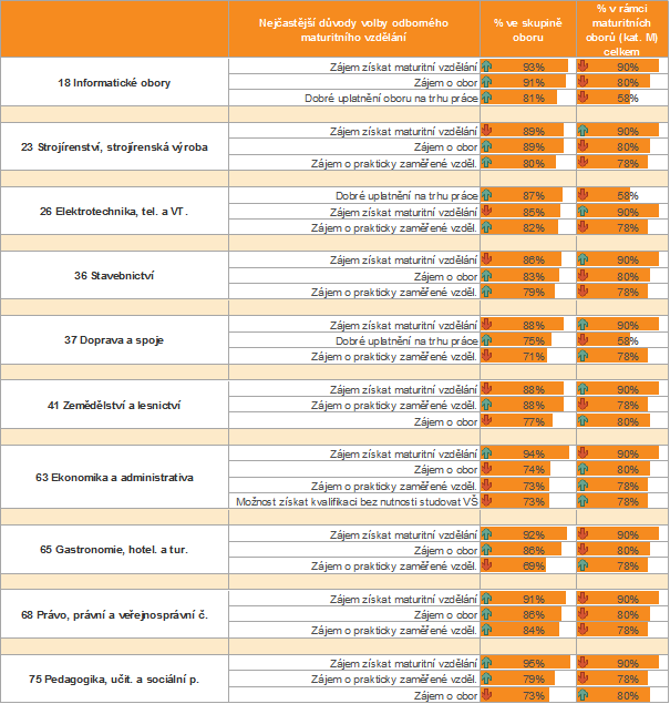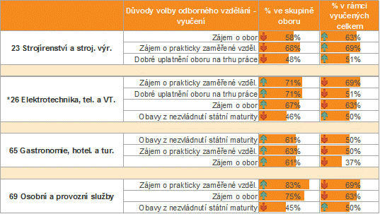 Tab.1: Nejčastější důvody volby učební úrovně vzdělání – vybrané skupiny oborů (v % odpovědí rozhodně ano + spíše ano)[1][2]