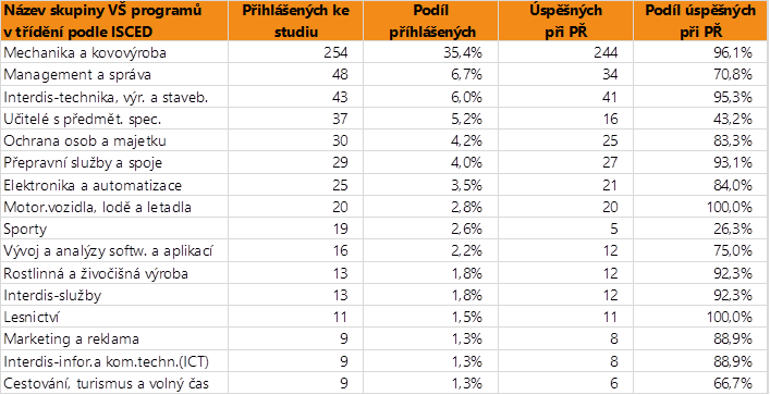 V dalším textu jsou uvedeny vždy údaje o zájmu a úspěšnosti absolventů dané skupině oborů SŠ jako celku, v tabulce jsou pak hodnoty přihlášených a úspěšných zájemců o vysokoškolské vzdělání pro skupiny VŠ programů, do kterých se hlásí větší počet či podíl absolventů. Jsou zahrnuti přihlášení do bakalářských i nenavazujících magisterských programů.