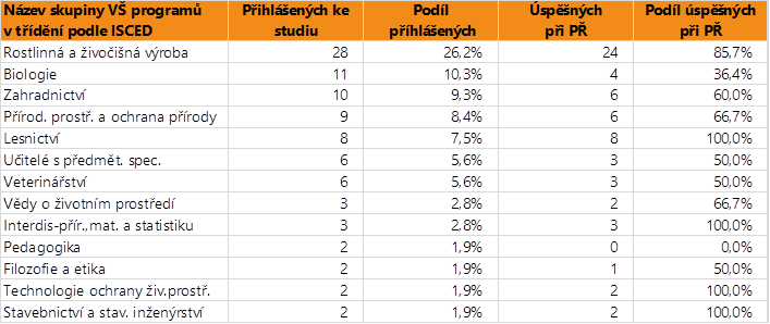 V následující tabulce je uvedeno, do jakých skupin vzdělávací programů vysokých škol (v třídění podle ISCED) se absolventi této skupiny středoškolských oborů hlásí a jak jsou úspěšní v přijímacím řízení.