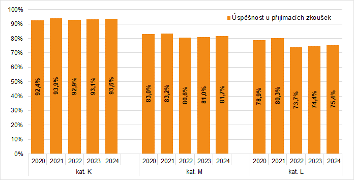 Při přijímacím řízení jsou absolventi středoškolského studia úspěšní v různé míře, jejich úspěšnost se podle kategorie studia pohybuje od 94 % v případě gymnázií až do 75 % v případě absolventů kategorie L.