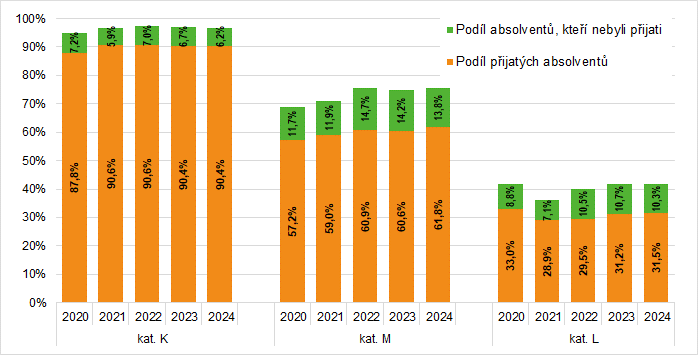 Vedle údajů o úspěšnosti při přijímacím řízení jsou významné i informace o podílu přijatých a nepřijatých z celkového počtu absolventů dané kategorie. Z uvedených obrázků je zřejmé, že zatímco úspěšnost u přijímacího řízení se pohybuje v rozsahu od 94 % u gymnazistů do 75 % u absolventů kategorie L, podíly přijatých z celkového počtu absolventů jsou odlišné výrazněji. Je to dáno rozdílným podílem přihlášených k vysokoškolskému studiu.