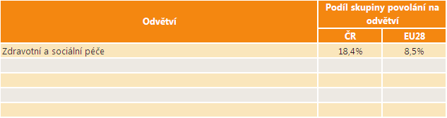 Odvětvová exkluzivita této skupiny je průměrná. Následující tabulka ukazuje ta odvětví, ve kterých má tato skupina povolání v ČR největší podíl na jejich celkovém počtu zaměstnaných. Pro porovnání je uveden i podíl této skupiny povolání na odvětvích v EU28.
