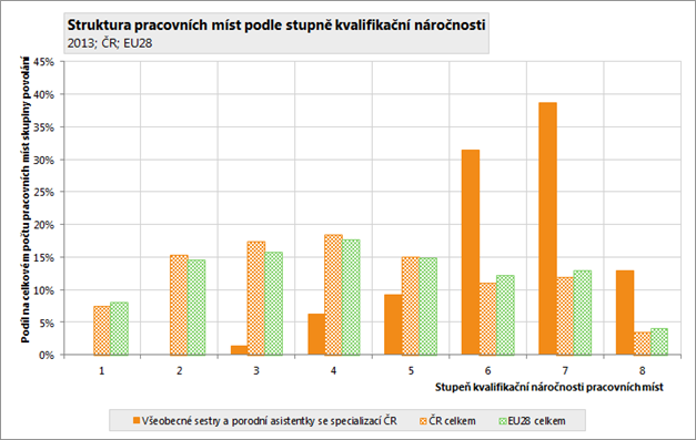 Kvalifikační náročnost pracovních míst je ukazatel, zahrnující v sobě nejen vzdělání potřebné pro dané pracovní místo, ale i další zapracování v podobě praxe. Čím vyšší stupeň, tím vyšší kvalifikační nároky jsou pro dané pracovní místo požadovány. Celková úroveň kvalifikační náročnosti (požadavků) pracovních míst obsazených osobami ze skupiny povolání Všeobecné sestry a porodní asistentky se specializací činila v roce 2013 v ČR 6,38 bodu (na osmistupňové škále). To je o 2,23 bodu více, než je kvalifikační náročnost všech pracovních míst v celé ČR. V EU28 činila v roce 2013 úroveň kvalifikačních požadavků pracovních míst obsazených osobami s touto skupinou povolání 6,37 bodu, byla tedy o 0,01 bodu nižší, než kvalifikační náročnost pracovních míst obsazená těmito osobami v ČR. V porovnání se všemi pracovními místy v EU28 je kvalifikační náročnost pracovních míst obsazených osobami ze skupiny povolání Všeobecné sestry a porodní asistentky se specializací vyšší, než je kvalifikační náročnost pracovních míst v celé EU28 a to o 2,14 bodu.