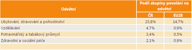 Odvětvová exkluzivita této skupiny je nadprůměrná. Následující tabulka ukazuje ta odvětví, ve kterých má tato skupina povolání v ČR největší podíl na jejich celkovém počtu zaměstnaných. Pro porovnání je uveden i podíl této skupiny povolání na odvětvích v EU28.