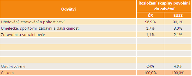 Největší část osob ze skupiny povolání Číšníci, servírky a barmani je v ČR zaměstnána v odvětví Ubytování, stravování a pohostinství. Dalšími významnějšími zaměstnavateli jsou pro tuto skupinu povolání odvětví Umělecké, sportovní, zábavní a další činnosti a Zdravotní a sociální péče. Následující tabulka porovnává, jaká je distribuce zaměstnaných osob z této skupiny povolání do odvětví v ČR a v EU28.