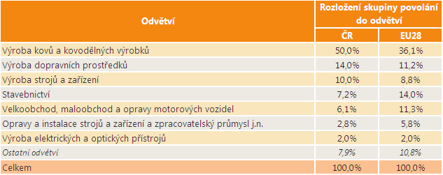 Odvětvová exkluzivita této skupiny je podprůměrná. Následující tabulka ukazuje ta odvětví, ve kterých má tato skupina povolání v ČR největší podíl na jejich celkovém počtu zaměstnaných. Pro porovnání je uveden i podíl této skupiny povolání na odvětvích v EU28.