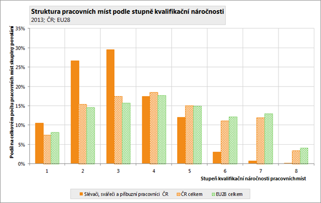 Kvalifikační náročnost pracovních míst je ukazatel, zahrnující v sobě nejen vzdělání potřebné pro dané pracovní místo, ale i další zapracování v podobě praxe. Čím vyšší stupeň, tím vyšší kvalifikační nároky jsou pro dané pracovní místo požadovány. Celková úroveň kvalifikační náročnosti (požadavků) pracovních míst obsazených osobami ze skupiny povolání Slévači, svářeči a příbuzní pracovníci činila v roce 2013 v ČR 3,06 bodu (na osmistupňové škále). To je o 1,10 bodu méně, než je kvalifikační náročnost všech pracovních míst v celé ČR. V EU28 činila v roce 2013 úroveň kvalifikačních požadavků pracovních míst obsazených osobami s touto skupinou povolání 3,03 bodu, byla tedy o 0,03 bodu nižší, než kvalifikační náročnost pracovních míst obsazená těmito osobami v ČR. V porovnání se všemi pracovními místy v EU28 je kvalifikační náročnost pracovních míst obsazených osobami ze skupiny povolání Slévači, svářeči a příbuzní pracovníci nižší, než je kvalifikační náročnost pracovních míst v celé EU28 a to o 1,21 bodu.