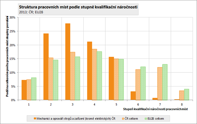 Kvalifikační náročnost pracovních míst je ukazatel, zahrnující v sobě nejen vzdělání potřebné pro dané pracovní místo, ale i další zapracování v podobě praxe. Čím vyšší stupeň, tím vyšší kvalifikační nároky jsou pro dané pracovní místo požadovány. Celková úroveň kvalifikační náročnosti (požadavků) pracovních míst obsazených osobami ze skupiny povolání Mechanici a opraváři strojů a zařízení (kromě elektrických) činila v roce 2013 v ČR 3,27 bodu (na osmistupňové škále). To je o 0,89 bodu méně, než je kvalifikační náročnost všech pracovních míst v celé ČR. V EU28 činila v roce 2013 úroveň kvalifikačních požadavků pracovních míst obsazených osobami s touto skupinou povolání 3,29 bodu, byla tedy o 0,02 bodu vyšší, než kvalifikační náročnost pracovních míst obsazená těmito osobami v ČR. V porovnání se všemi pracovními místy v EU28 je kvalifikační náročnost pracovních míst obsazených osobami ze skupiny povolání Mechanici a opraváři strojů a zařízení (kromě elektrických) nižší, než je kvalifikační náročnost pracovních míst v celé EU28 a to o 0,96 bodu.