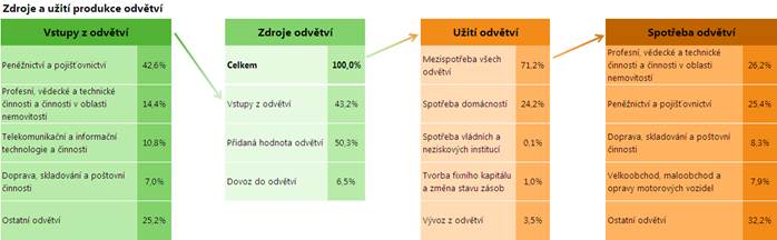 Následující schéma ukazuje, jaká je struktura zdrojů a užití v tomto odvětví. Na jedné straně jde o zdroje využité v odvětví - jedná se buď o spotřebované vstupy z jiných odvětví ekonomiky ČR (nebo ze stejného odvětví, avšak od jiných ekonomických subjektů), případně o vlastní výrobu (přidaná hodnota odvětví) nebo o vstupy ze zahraničí (dovoz). Druhá část schématu potom naopak ukazuje, kde jsou výstupy (produkty a služby) tohoto odvětví využívány. Výstupy z tohoto odvětví mohou sloužit buď jako vstup (zdroje) pro jiná odvětví, nebo mohou být spotřebovány (koupeny) domácnostmi či vládou nebo neziskovými institucemi. Další možností je, že výstupy tohoto odvětví poslouží pro tvorbu fixního kapitálu či zůstanou uloženy ve formě zásob. Poslední možností je, že výstupy tohoto odvětví budou spotřebovány v cizině (vývoz).