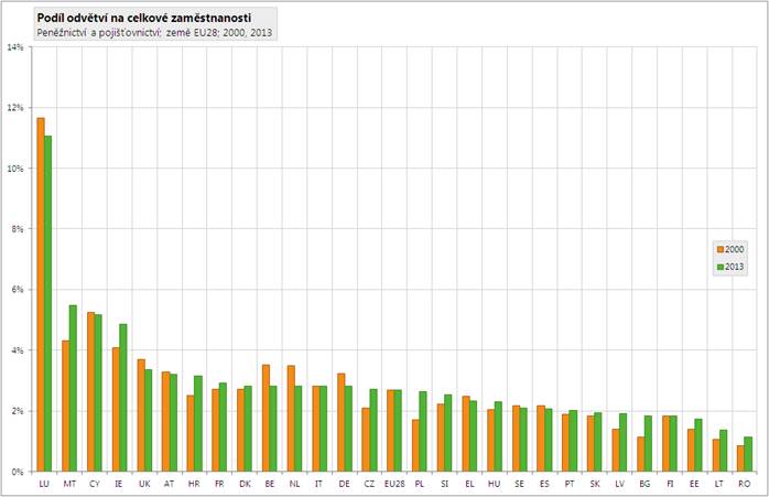 Nárůst produktivity práce, který byl v České republice v odvětví Peněžnictví a pojišťovnictví nižší, než růst celkové produkce, způsobil mezi roky 2000-2014 zvýšení počtu zaměstnaných osob. Od roku 2000 se jejich počet zvýšil o necelých 22 tisíc, tedy zhruba o 22 %. V roce 2014 bylo v tomto odvětví v ČR zaměstnáno necelých 122 tisíc osob. Podíl odvětví na celkové zaměstnanosti se v ČR mezi roky 2000-2014 zvýšil z 2,1 % na 2,4 %. V porovnání s podílem tohoto odvětví na celkové zaměstnanosti vůči EU28 je v ČR podíl odvětví Peněžnictví a pojišťovnictví nižší, neboť v EU28 má toto odvětví na celkové zaměstnanosti podíl 2,7 %. Následující graf porovnává podíl tohoto odvětví na celkové zaměstnanosti v jednotlivých zemích EU28.