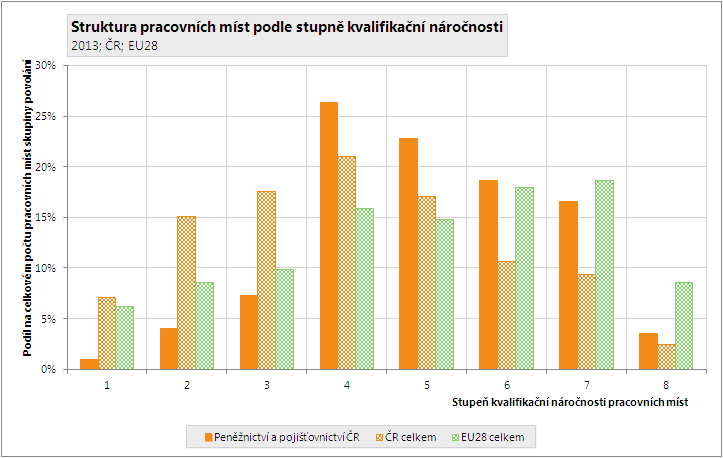 Kvalifikační náročnost pracovních míst je ukazatel, zahrnující v sobě nejen vzdělání potřebné pro dané pracovní místo, ale i další zapracování v podobě praxe. Čím vyšší stupeň, tím vyšší kvalifikační nároky jsou pro dané pracovní místo požadovány. Celková úroveň kvalifikační náročnosti (požadavků) pracovních míst v odvětví Peněžnictví a pojišťovnictví činila v roce 2013 v ČR 5,06 bodu (na osmistupňové škále). To je o 0,99 bodu více, než je kvalifikační náročnost všech pracovních míst v celé ČR. V EU28 činila v roce 2013 úroveň kvalifikačních požadavků pracovních míst v tomto odvětví 5,84 bodu, byla tedy o 0,78 bodu vyšší, než kvalifikační náročnost pracovních míst v tomto odvětví v ČR. V porovnání se všemi pracovními místy v EU28 je kvalifikační náročnost pracovních míst odvětví Peněžnictví a pojišťovnictví vyšší, než je kvalifikační náročnost pracovních míst v celé EU28 a to o 0,89 bodu.