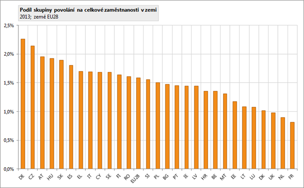 V EU28 bylo v roce 2013 v této skupině povolání zaměstnáno zhruba 3,4 milionu osob. V EU28 tato skupina povolání tvoří 1,6 % ze všech zaměstnaných, tedy o 0,5 procentních bodů méně, než je podíl této skupiny povolání na zaměstnaných v ČR.