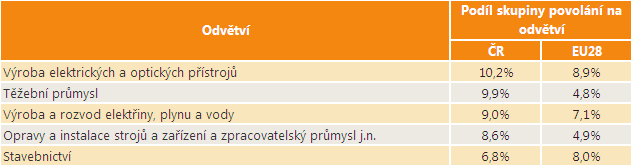 Odvětvová exkluzivita této skupiny je nadprůměrná. Následující tabulka ukazuje ta odvětví, ve kterých má tato skupina povolání v ČR největší podíl na jejich celkovém počtu zaměstnaných. Pro porovnání je uveden i podíl této skupiny povolání na odvětvích v EU28.