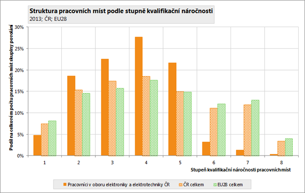 Kvalifikační náročnost pracovních míst je ukazatel, zahrnující v sobě nejen vzdělání potřebné pro dané pracovní místo, ale i další zapracování v podobě praxe. Čím vyšší stupeň, tím vyšší kvalifikační nároky jsou pro dané pracovní místo požadovány. Celková úroveň kvalifikační náročnosti (požadavků) pracovních míst obsazených osobami ze skupiny povolání Pracovníci v oboru elektroniky a elektrotechniky činila v roce 2013 v ČR 3,59 bodu (na osmistupňové škále). To je o 0,57 bodu méně, než je kvalifikační náročnost všech pracovních míst v celé ČR. V EU28 činila v roce 2013 úroveň kvalifikačních požadavků pracovních míst obsazených osobami s touto skupinou povolání 3,58 bodu, byla tedy o 0,01 bodu nižší, než kvalifikační náročnost pracovních míst obsazená těmito osobami v ČR. V porovnání se všemi pracovními místy v EU28 je kvalifikační náročnost pracovních míst obsazených osobami ze skupiny povolání Pracovníci v oboru elektroniky a elektrotechniky nižší, než je kvalifikační náročnost pracovních míst v celé EU28 a to o 0,66 bodu.