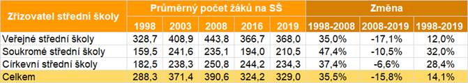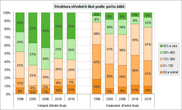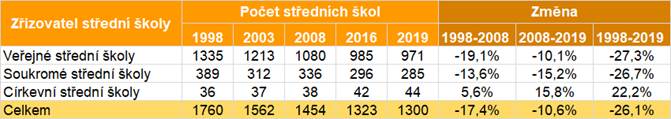Celkový počet středních škol se v letech 1998–2019 snížil o více než čtvrtinu. V roce 2019 bylo v ČR 1300 středních škol. Podíl veřejných škol v roce 2019 byl 74,7 % (soukromých škol bylo 21,9 % a církevních 3,4 %).