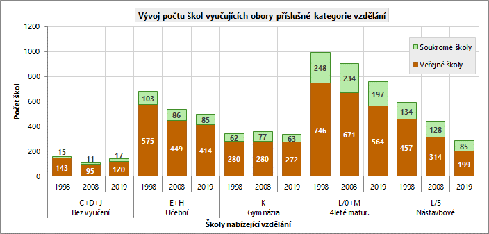 Počty soukromých i veřejných škol nabízejících učební obory se od roku 1998 snížily o 28 %.