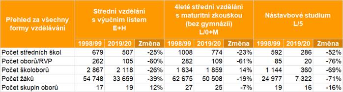 *    Počet škol nabízejících střední vzdělání poklesl celkově o 26 %. Nejvýraznější pokles zaznamenala kategorie nástavbového studia (o více než polovinu), v případě středního vzdělání s výučním listem a čtyřletého vzdělání s maturitní zkouškou nastalo snížení zhruba o čtvrtinu.
