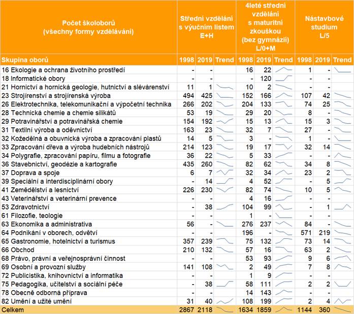 *    Počet školoborů v rámci středního odborného vzdělávání v období 1998–2019 poklesl celkově o 16 %, přičemž k nejvýraznějšímu snížení došlo v nástavbovém studiu (o 69 %). V případě středního vzdělání s výučním listem dosáhl pokles 26 % a 4leté střední odborné vzdělání s maturitní zkouškou dokonce zaznamenalo mírný nárůst počtu školoborů (o 14 %).