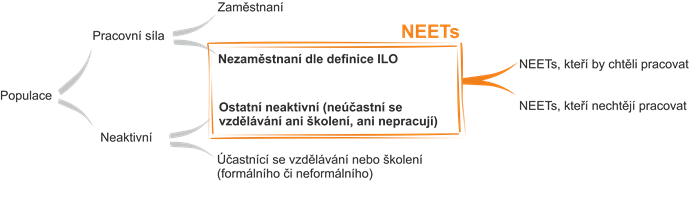 Zkratka NEETs (people Neither in Employment nor in Education and Training) se vžila pro označení skupiny těch, kteří v době zjišťování nepracují (podle definice International Labour Organisation – viz dole vysvětlení pojmů) ani se nevzdělávají (neúčastní se formálního ani neformálního vzdělávání nebo školení).