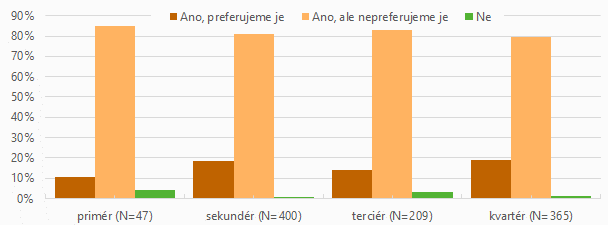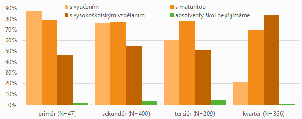 Firmy a instituce kvartérního sektoru vzhledem k jejich produkci a činnosti přijímají zejména absolventy s vysokoškolským vzděláním (84 %) a absolventy s maturitním vzděláním (70 %). Absolventy s výučním listem přijímají pouze v malé míře (22 %). Zaměstnavatelé kvartérního sektoru jsou celkově nakloněni k přijímaní absolventů škol, pouze 1 % z nich uvedlo, že absolventy nepřijímá a ani v minulosti žádného nepřijalo.