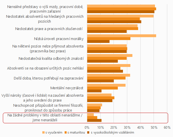 Druhá skupina důvodů, na kterou zaměstnavatelé při přijímání absolventů narážejí, zahrnuje důvody, které nemohou absolventi sami přímo ovlivnit. Část firem (43 %) uvádí, že by o absolventy škol měla zájem, ale na trhu práce je jich nedostatek. Necelá třetina zaměstnavatelů na pracovní pozici nemůže absolventa přijmout, protože pro danou pracovní pozici je nezbytná praxe a pracovníka bez praxe na ni nelze přijmout. Více než čtvrtina zaměstnavatelů má zkušenosti s tím, že se na hledané pracovní pozice absolventi nehlásí.