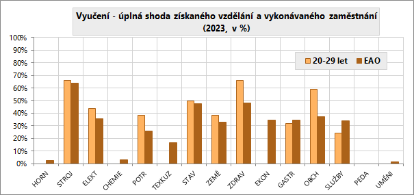 Vyučení mají v průměru vysokou úroveň úplné shody – ta je 43 % všech ekonomicky aktivních osob (EAO), u absolventů ve věku 20-29 let je úroveň dosažené úplné shody o něco vyšší – 46 %. V jednotlivých skupinách oborů jsou hodnoty dosažené úplné shody do značné míry rozdílné.