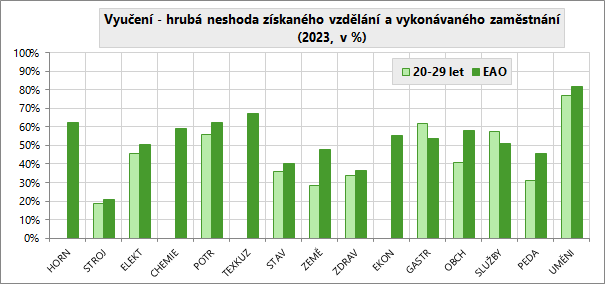 Hrubou neshodu mezi svým vzděláním a vykonávaným zaměstnáním nacházíme až u 43 % vyučených. U mladých 20-29letých absolventů je míra těch, kteří pracují v hrubé neshodě, o něco nižší – 40 %. I tady lze pozorovat velké rozdíly mezi jednotlivými skupinami oborů.