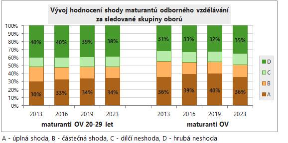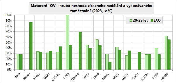 Hrubou neshodu mezi svým vzděláním a vykonávaným zaměstnáním vykazuje až 35 % pracovníků s maturitou ve středním odborném vzdělávání. U mladých 20-29letých absolventů je míra těch, kteří pracují v hrubé neshodě, vyšší - až 38 %. I tady lze pozorovat velké rozdíly mezi jednotlivými skupinami oborů.