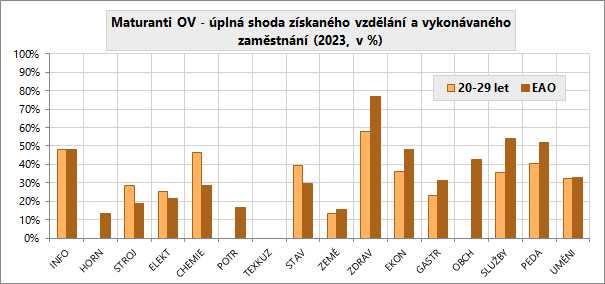 Pedagogika, učitelství a sociální péče – pracující vzdělaní v pedagogických oborech maturitní úrovně vzdělání až v polovině případů pracují na pozicích v úplné shodě. V případě absolventů ve věku 20–29 let situace není natolik příznivá.
