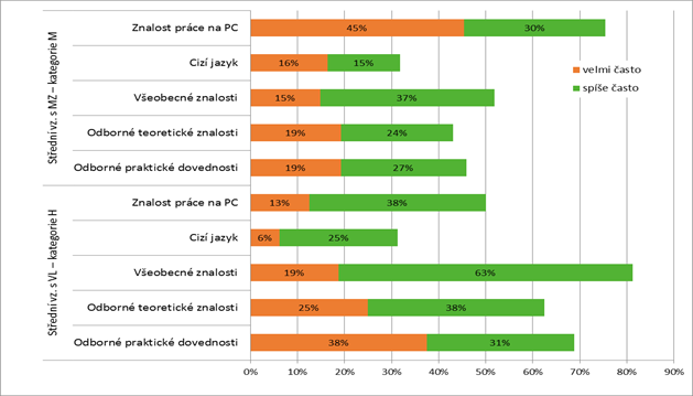 Porovnáme-li obě kategorie, pak absolventi učebních oborů využívají ze znalostí a kompetencí získaných na střední škole častěji odborné teoretické i praktické znalosti, naopak méně často práci na PC a cizí jazyk. Poněkud překvapivě také častěji využívají všeobecné znalosti, i když jen „spíše často“. Důvodem rozdílů je jak obsah a náplň práce, tak i skutečnost, že většina absolventů maturitních oborů pokračuje v terciárním vzdělávání, ve kterém si odborné i všeobecné znalosti dále rozšiřují. Ze svého pohledu tedy využívají více znalosti získané v průběhu terciárního vzdělávání než znalosti ze střední školy. Dalším faktorem, který ovlivňuje vyšší využití odborných znalostí a dovedností v kategorii vyučených, je skutečnost, že absolventi učebních oborů častěji pracují přímo ve svém oboru. S odstupem tří let od ukončení studia byl tento podíl 46 % v kategorii vyučených a 33 % v kategorii absolventů maturitních oborů.[1]