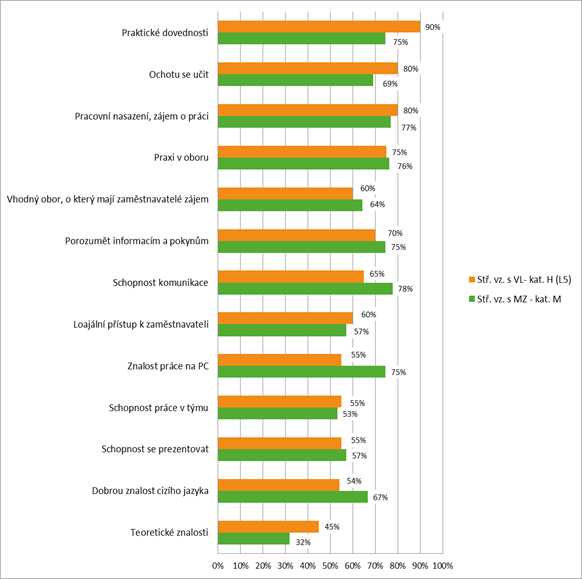 Z hlediska odpovědi „rozhodně ano“[2] absolventi učebních oborů pro úspěšný vstup na trh práce nejvíce potřebují praktické dovednosti (90 %), dále ochotu se učit (80 %), pracovní nasazení, zájem o práci (80 %) a praxi v oboru (75 %).