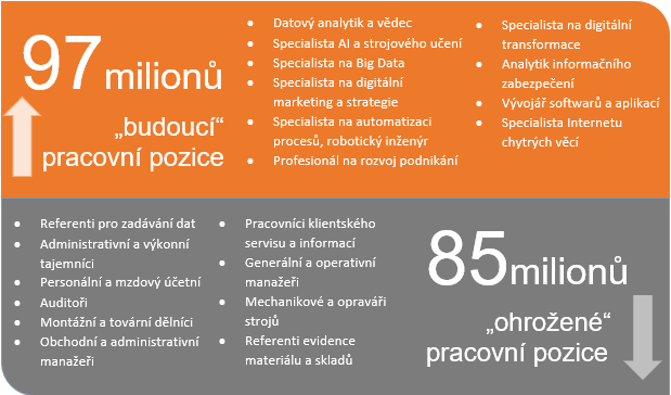 Nastupující průmyslová revoluce pracuje s předpokladem, že dojde k úbytku pracovních míst především pro méně kvalifikované pracovníky. Nicméně díky rychlému technologickému pokroku bude zánik pracovních míst kompenzován nově vznikajícími pracovními pozicemi a obory. Mezinárodní šetření s názvem The Future of Jobs uvádí, že do roku 2025 bude podíl „nadbytečných“ neboli ohrožených pracovních pozic klesat ze současných 15,4 % na 9 % pracovní síly, přičemž obsazování nově vznikajících pracovních pozic poroste ze 7,8 % na 13,5 %. Podle nastíněného vývoje by tak do roku 2025 mohlo být nahrazeno až 85 milionů pracovních míst v souvislosti s přechodem do nové ekonomické struktury. Na druhou stranu se může objevit až 97 milionů nových pracovních příležitostí přizpůsobených právě průmyslu 4.0. [WEF 2020]. Níže uvedený obrázek jmenovitě zobrazuje nově vznikající pracovní pozice, a naopak ohrožené pracovní pozice, tedy zaměstnance, které bude třeba v rámci nové distribuce práce mezi lidmi, stroji a algoritmy přemístit na jiné pozice.