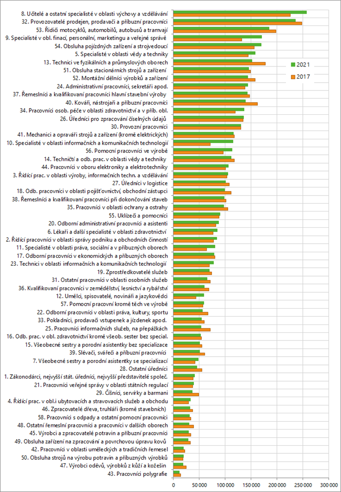 V následující tabulce jsou uvedeny počty zaměstnaných v jednotlivých profesních skupinách v letech 2017 a 2021 a jejich nárůst či pokles mezi lety 2017 a 2021. Pro názornost a snadnou orientaci jsou vytvořeny barevné pruhy, oranžové avizují nárůsty, zelené pak poklesy v počtu pracovníků.