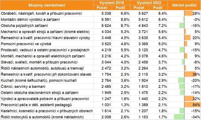 Tabulky uvedené dále obsahují totiž seznam skupin zaměstnání, ve kterých se v roce 2018 a v roce 2022 uplatňovalo nejvíce vyučených či maturantů, kteří byli ve věku 20 až 24 let. Do tabulek byly zařazeny skupiny zaměstnání, ve kterých počet mladých zaměstnaných v roce 2022 převyšoval 1000 vyučených a 1500 maturantů. Pro určení zaměstnání, které osoba vykonává, není podstatné, zda je vzdělán v odpovídajícím oboru nebo ve zcela jiném.