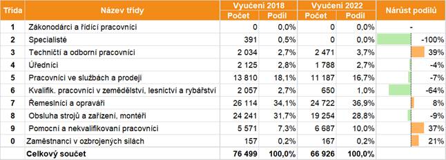 Jistě zajímavý je sloupec „Nárůst podílů“, ze kterého jsou zřejmé rozdíly mezi zastoupením jednotlivých skupin povolání v letech 2018 a 2022. Délka pruhů upozorňuje, kde došlo k výraznějším poklesům (zelená) a kde k nárůstům (oranžová).