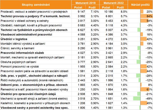 Největší počty maturantů ve věku 20 až 24 let pracovaly v roce 2022 ve skupinách zaměstnání Prodavači, vedoucí a ostatní pracovníci v prodejnách, Technici provozu a podpory IT a komunikačních technologií, Pracovníci v oblasti ochrany a ostrahy, Obráběči, nástrojaři, kováři a příbuzní pracovníci a Technici ve fyzikálních a průmyslových oborech.