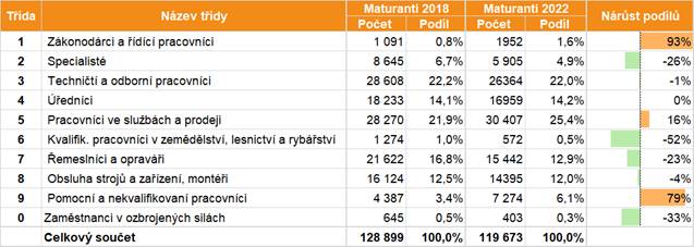 Přehled o tom, jaké počty a podíly maturantů pracují na pozicích, kde se obvykle předpokládá vyšší či nižší vzdělanostní úroveň, poskytuje následující tabulka. V roce 2022 pracovalo asi 6,5 % maturantů v zaměstnáních odpovídajících vyšší úrovni vzdělání (třída zaměstnání 1 a 2), 25 % ve třídě 5 (Pracovníci ve službách a prodeji), kde převládají zaměstnání s úrovní odpovídající vyučení, 25 % ve vysloveně dělnických zaměstnáních (třída 7 a 8) a 6 % dokonce jako pomocní a nekvalifikovaní pracovníci. K nárůstu jejich podílu proti roku 2018 došlo ve třídě řídících pracovníků a pomocných a nekvalifikovaných.