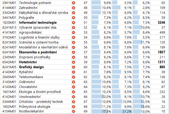 · vysokou mírou nezaměstnanosti (v pravém sloupci tabulky – řazeno od nejvyšší míry nezaměstnanosti), jejichž případnou volbu je vhodné opravdu zvážit, mít ji podloženou skutečným zájmem o profesi, na kterou obor připravuje, nebo mít pro uplatnění v ní rodinné zázemí či zájem budoucího zaměstnavatele.