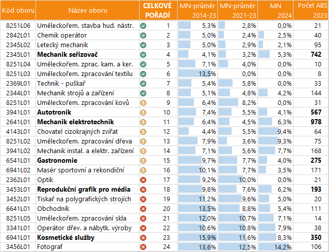 · nízkou míru nezaměstnanosti (řazeny od nejnižší míry nezaměstnanosti) a jsou snadno dostupné (s nadprůměrným počtem absolventů v roce 2024). Kliknutím se dostanete přímo na stránku s informacemi o oboru a školách, které obor nabízejí.