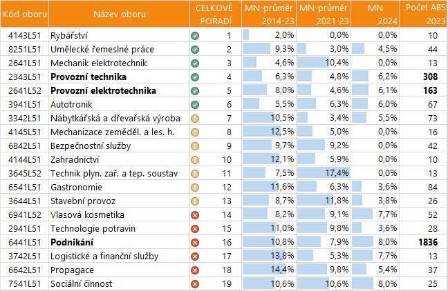 Podrobnější informace o všech oborech jsou v následujících tabulkách, kde jsou údaje o dlouhodobém (2016 až 2025) i krátkodobém průměru (2023 až 2025) a z údaje za rok 2025.