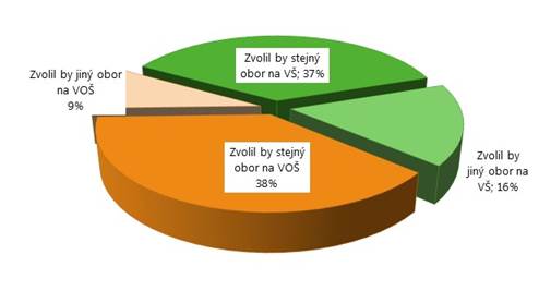 U absolventů vyšších odborných škol je podíl těch, kteří by si znovu zvolili svůj studijní obor, vysoký; na stejný obor by se hlásilo 75 % absolventů. Podíl absolventů, kteří jsou spokojeni s volbou svého oboru, je zde tedy vyšší než u vyučených a mírně vyšší i v porovnání s absolventy maturitních oborů středních odborných škol. Na druhé straně, stejný obor na VOŠ by studovalo jen 38 % absolventů VOŠ, zatímco 37 % by dalo přednost studiu tohoto oboru na VŠ. Přibližně 9 % by studovalo stejný obor na VOŠ a 16 % jiný obor na vysoké škole.